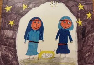 Packs of 5 (A6 approx.) quality Christmas Cards with envelopes, message inside ‘Happy Christmas’. Original Artwork by J Sams, F Bowman and Daisy.